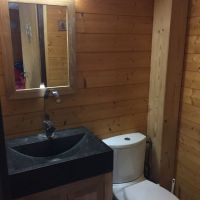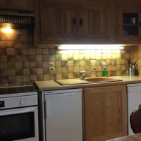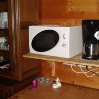 Le séjour avec cuisine à l’américaine : cuisinière électrique avec four, lave-vaisselle, micro-ondes, réfrigérateur… Ce séjour peut recevoir autour de sa table tous les hôtes du chalet, ainsi que ceux du Petit Paddock, si la location comporte l’autre chalet mitoyen. Puisque les deux chalets peuvent accueillir jusqu’à 16 personnes.