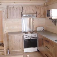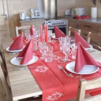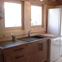 Le séjour avec cuisine à l’américaine : cuisinière électrique avec four, micro-ondes, réfrigérateur/congélateur… Ce séjour peut recevoir autour de sa table tous les hôtes du chalet, ainsi que ceux de l’ourson, si la location comporte les deux options.