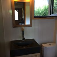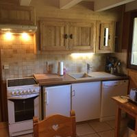 Au rez-de-chaussée : séjour, cuisine à l’américaine (cuisinière électrique avec four, lave-vaisselle, micro ondes, grille-pain, cafetière électrique, bouilloire…) et salle d’eau (douche, lavabo et toilettes).